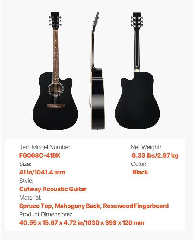 Size: 41 in/1041.4 mm,Color: Black,Item Model Number: FG068C-41BK,Style: Cutway Acoustic Guitar,Material: Spruce Top, Mahogany Back, Rosewood Fingerboard,Product Dimensions: 40.55 x 15.67 x 4.72 in/1030 x 398 x 120 mm,Net Weight: 6.33 lbs/2.87 kg