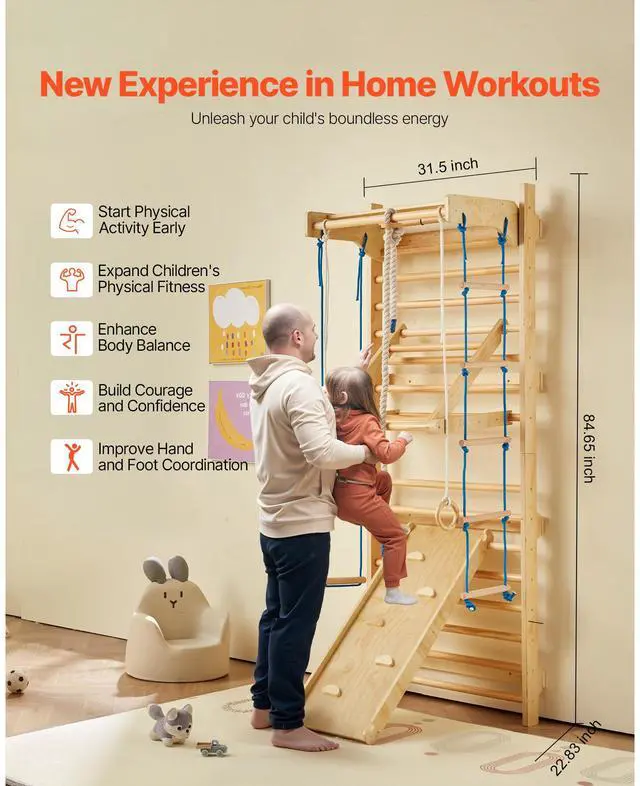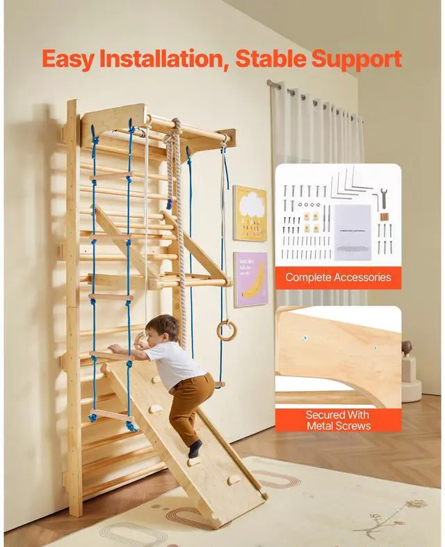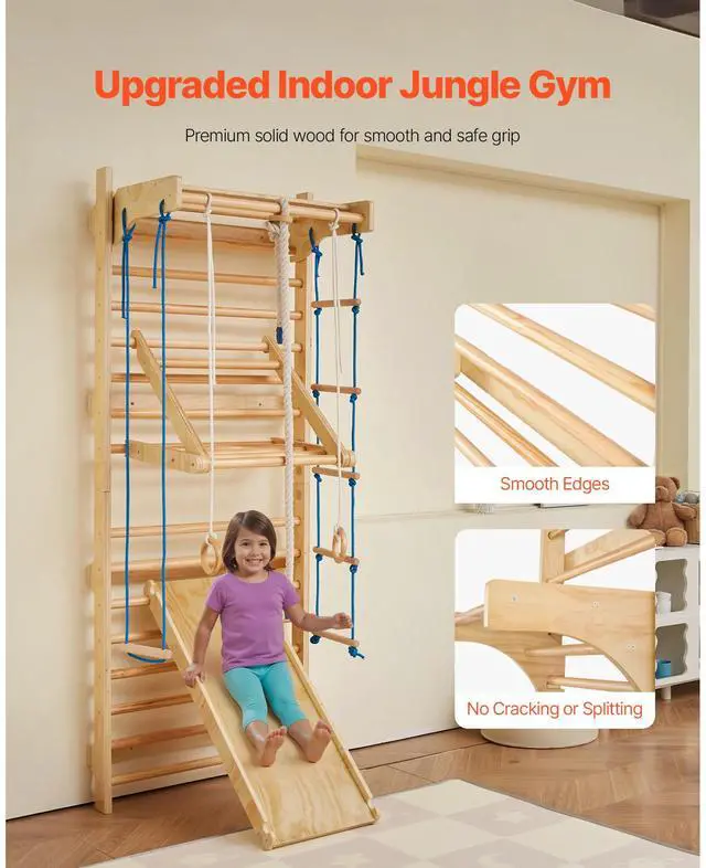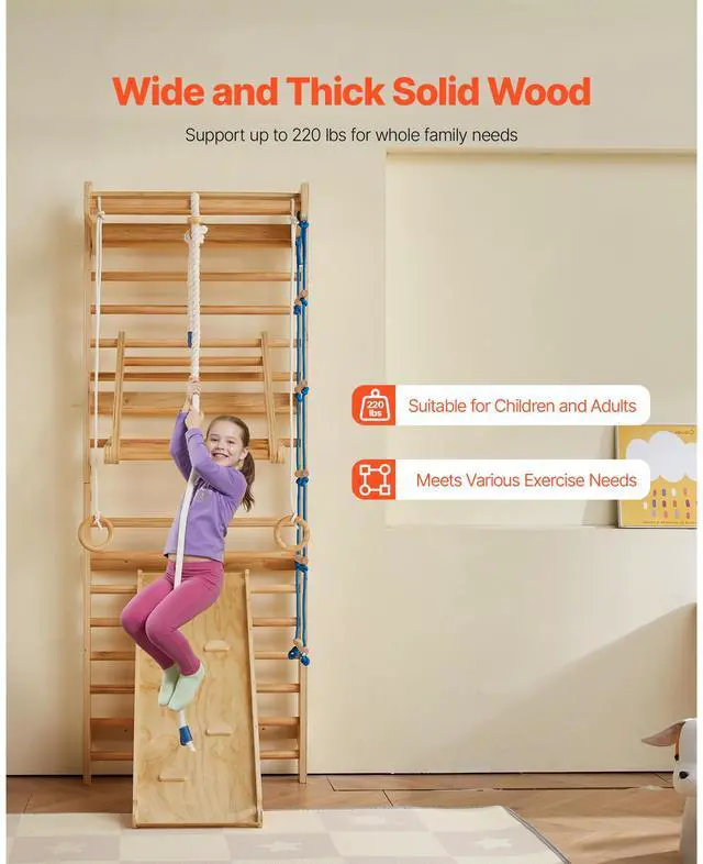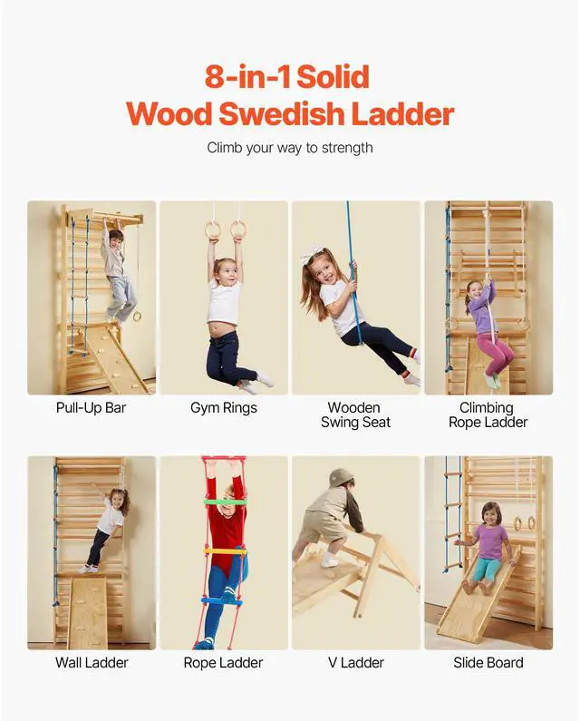 VEVOR Swedish Ladder Wall Gym 8 in 1 Wooden Indoor Playground Climbing Ladder
