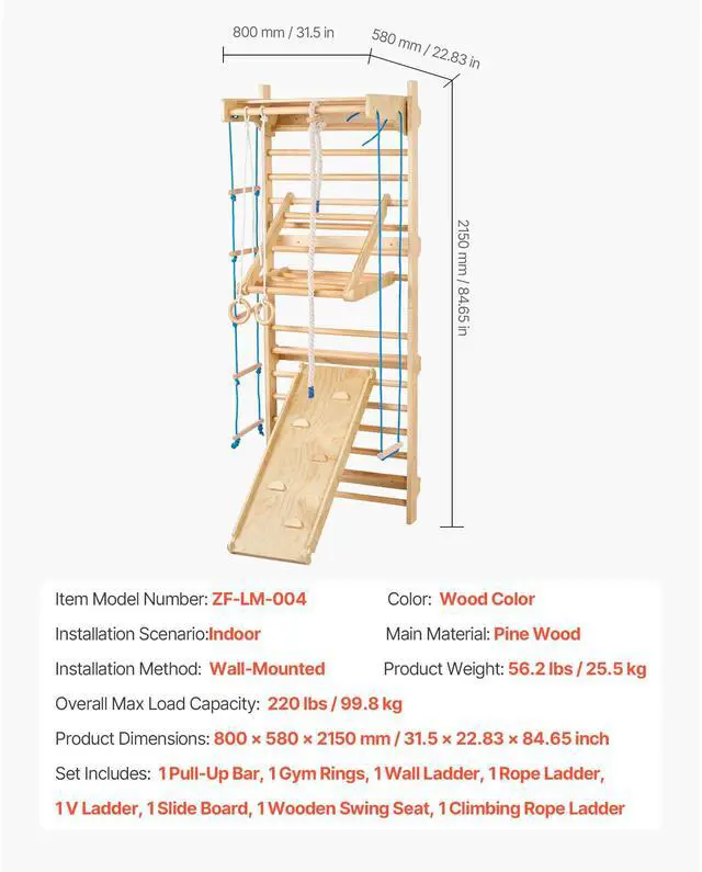 Product Type: 15-Level Wood Grip (8-In-1 Playset),Item Model Number: ZF-LM-004,Product Weight: 56.2 lbs / 25.5 kg,Max Load Capacity: 220 lbs/99.8 kg,Main Material: Pine Wood