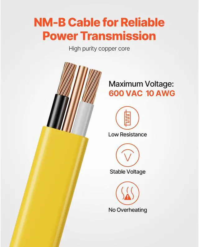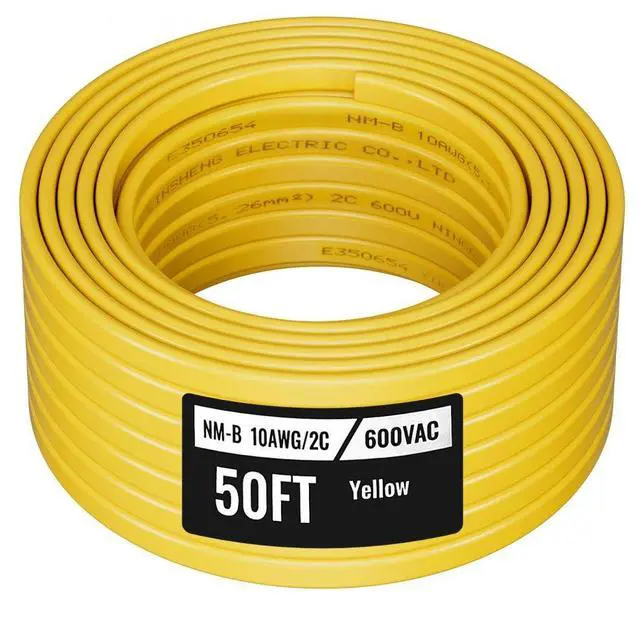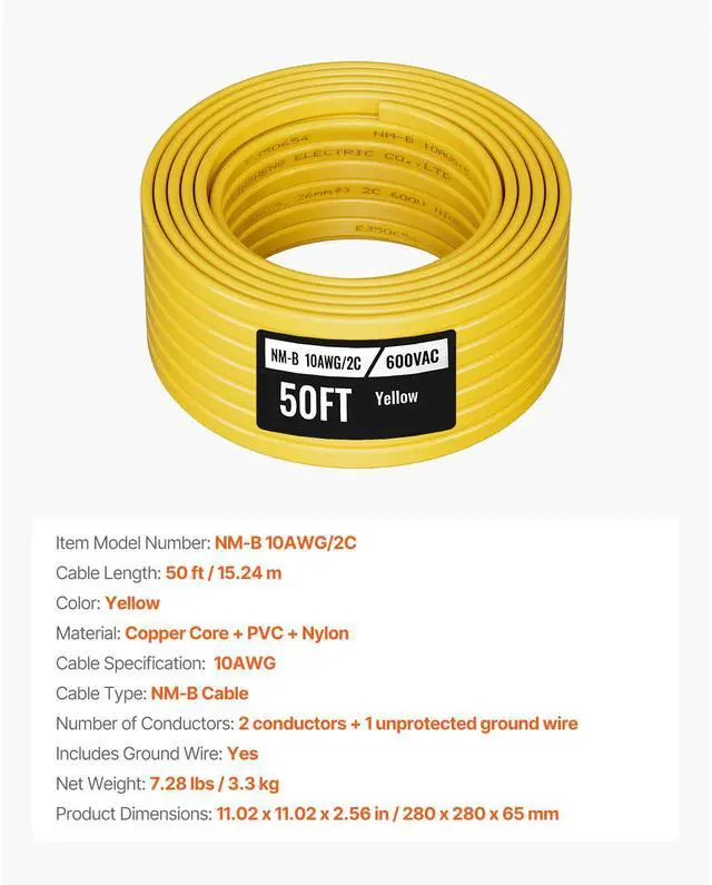 Cable Specification: 10AWG,Cable Type: NM-B Cable,Color: Yellow,Item Model Number: NM-B 10AWG/2C,Cable Length: 50 ft / 15.24 m,Material: Copper Core + PVC + Nylon,Product Dimensions: 11.02 x 11.02 x 2.56 in / 280 x 280 x 65 mm,Net Weight: 7.28 lbs / 3.3 kg,Includes Ground Wire: Yes,Number of Conductors: 2 conductors + 1 unprotected ground wire