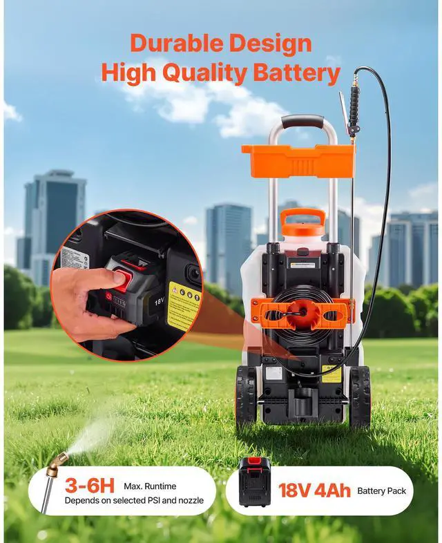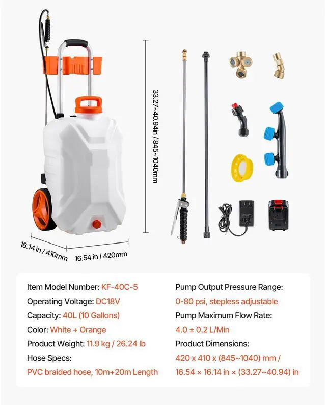 Hose Specs: PVC braided hose, 30m length,Capacity: 40L (10.5 Gallons),Operating Voltage: DC18V,Pump Maximum Flow Rate: 4.0 ± 0.2 L/Min,Color: White + Orange,Item Model Number: KF-40C-5,Product Weight: 12.6 kg / 27.78 lb,Pump Output Pressure Range: 0-80 psi, stepless adjustable,Product Dimensions (L x W x H): 470 × 420 × (860~1110) mm / 18.50 in × 16.54 in × (33.86 in ~ 43.70 in)