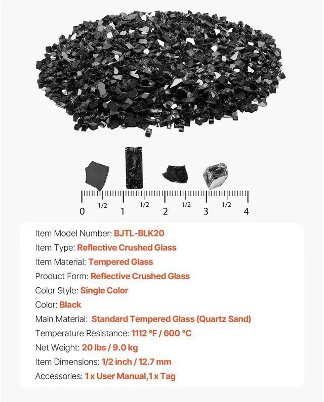 Product Form: Reflective Crushed Glass,Item Material: Tempered Glass,Color: Black,Item Model Number: BJTL-BLK20,Temperature Resistance: 1112 / 600 ,Color Style: Single Color,Item Dimensions: 1/2 inch / 12.7 mm,Item Type: Reflective Crushed Glass,Net Weight: 20 lbs / 9.0 kg,Main Material: Standard Tempered Glass (Quartz Sand)