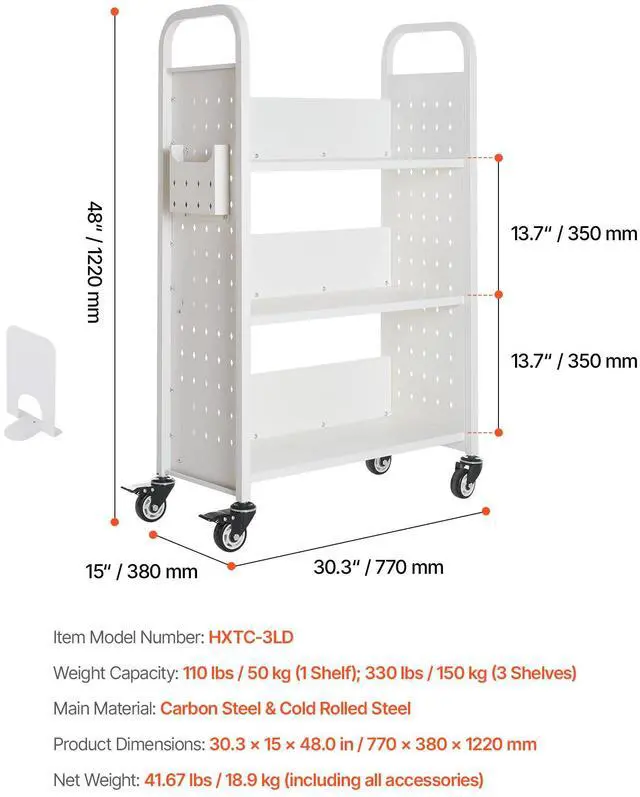 Weight Capacity: 110 lbs / 50 kg (1 Shelf); 330 lbs / 150 kg (3 Shelves),Item Model Number: HXTC-3LD,Product Dimensions: 30.3 x 15 x 48.0 in / 770 x 380 x 1220 mm,Net Weight: 41.67 lbs / 18.9 kg (including all accessories),Main Material: Carbon Steel & Cold Rolled Steel
