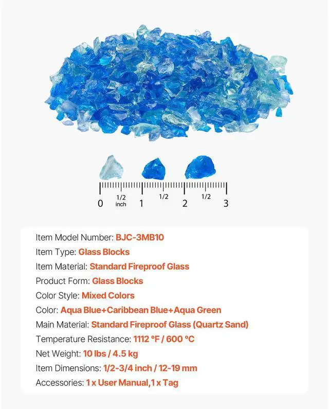 Product Form: Glass Blocks,Item Material: Standard Fireproof Glass,Color: Sea Blue + Light Blue + Water Green,Item Model Number: BJC-3MB10,Temperature Resistance: 1112 / 600 ,Color Style: Mixed Colors,Item Dimensions: 3/4 inch / 19.05 mm,Item Type: Glass Blocks,Net Weight: 10 lbs / 4.5 kg,Main Material: Standard Fireproof Glass (Quartz Sand)