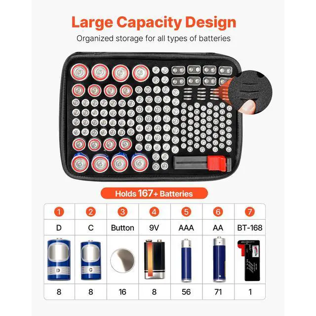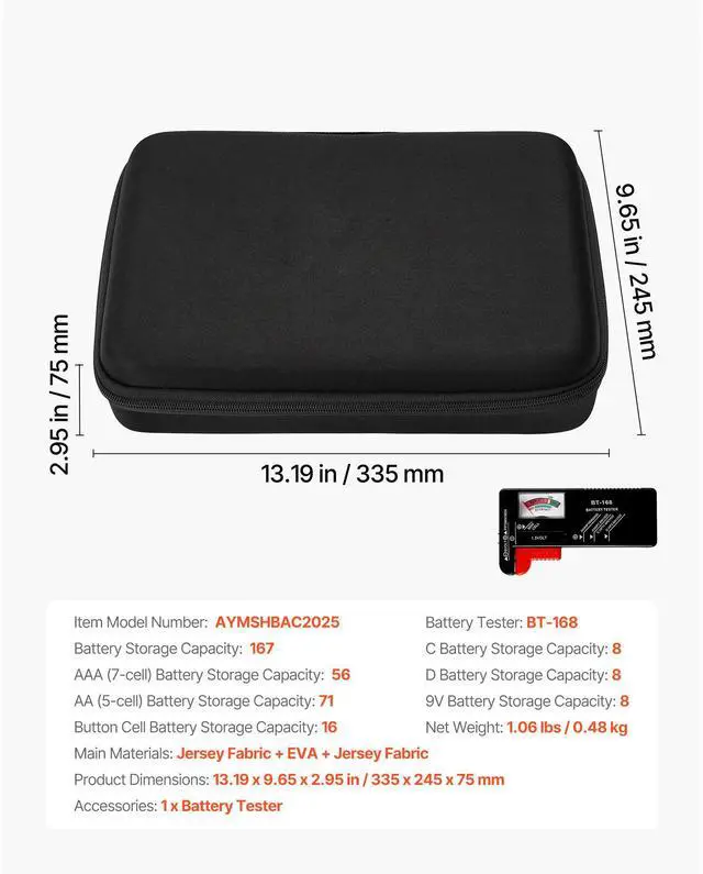AA (5-cell) Battery Storage Capacity: 71 PCS,Main Materials: Jersey Fabric + EVA + Jersey Fabric,Battery Storage Capacity: 167 PCS,D Battery Storage Capacity: 8 PCS,Item Model Number: AYMSHBAC2025,Battery Tester: BT-168,9V Battery Storage Capacity: 8 PCS,AAA (7-cell) Battery Storage Capacity: 56 PCS,Product Dimensions: 13.19 x 9.65 x 2.95 in / 335 x 245 x 75 mm,Net Weight: 1.06 lbs / 0.48 kg,C Battery Storage Capacity: 8 PCS,Button Cell Battery Storage Capacity: 16 PCS