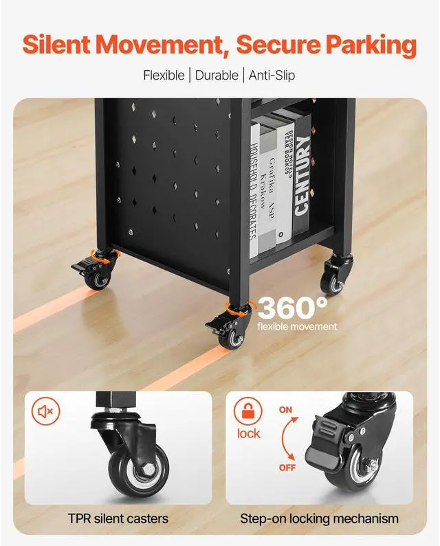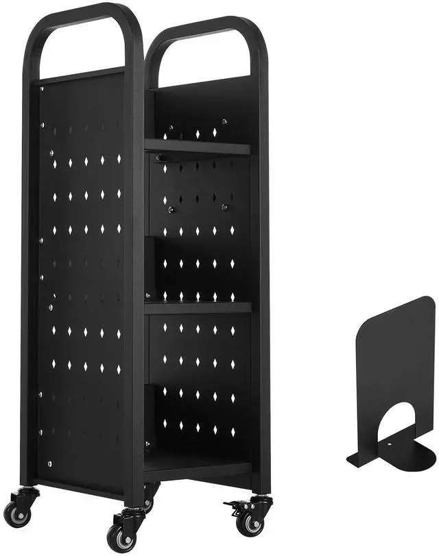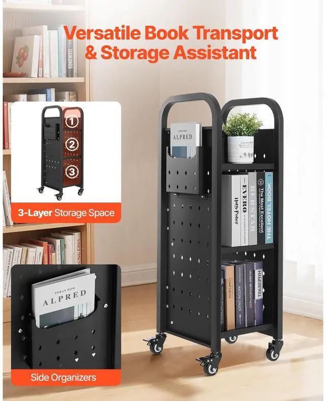 VEVOR 3-Tier Rolling Book Cart Single Sided L-Shaped Shelves Book Truck Black