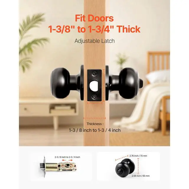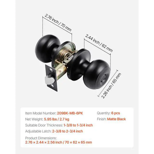Suitable Door Thickness: 1-3/8 to 1-3/4 inch,Item Model Number: 209BK-MB-6PK,Quantity: 6 pcs,Adjustable Latch: 2-3/8" to 2-3/4" Backset,Product Dimensions: 2.76 x 2.44 x 2.56 inch / 70 x 62 x 65 mm,Finish: Matte Black,Net Weight: 5.95 lbs / 2.7 kg