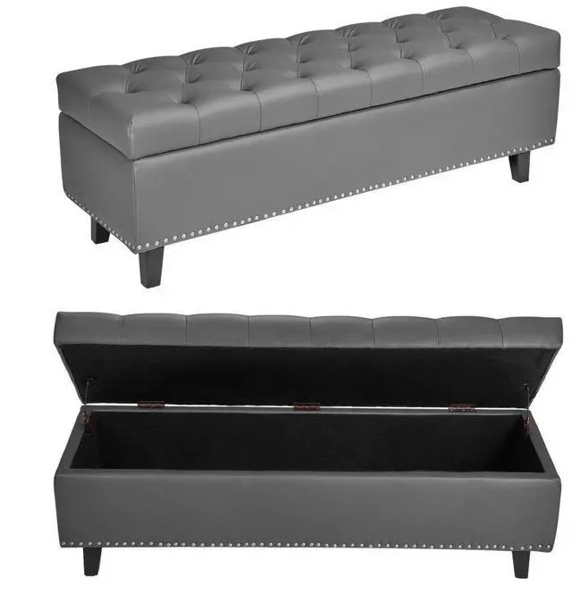 Button-Tufted Storage Ottoman Bench PU Leather Bench with Wood Legs Gray