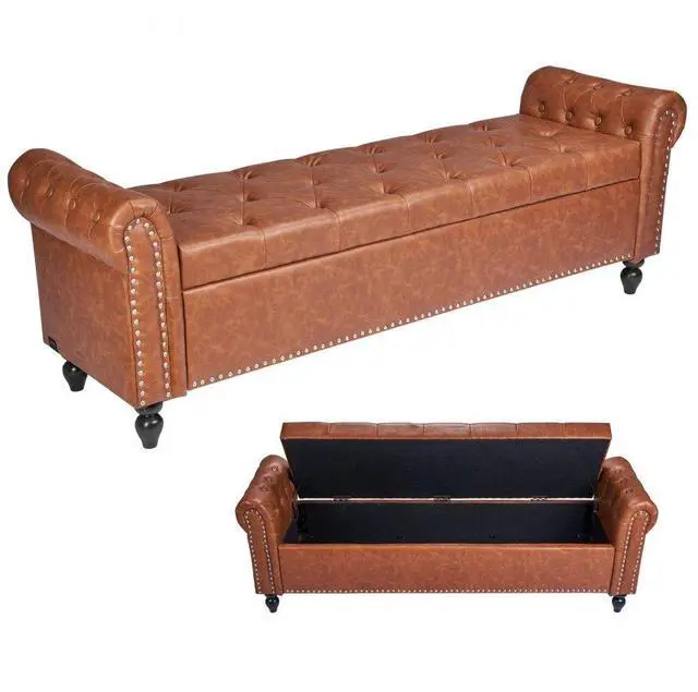 Button-Tufted Storage Ottoman Bench Rolled Arm PU Leather Wood Legs Brown
