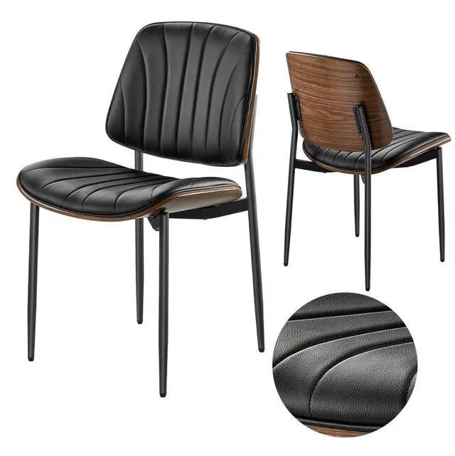 Set of 2 Dining Chairs Modern Leather Kitchen Side Chair Back Metal Legs Black