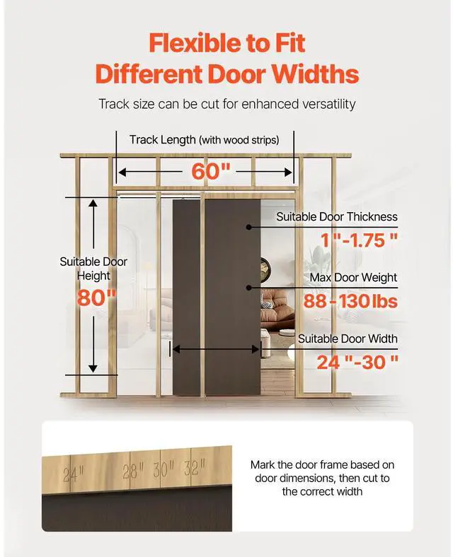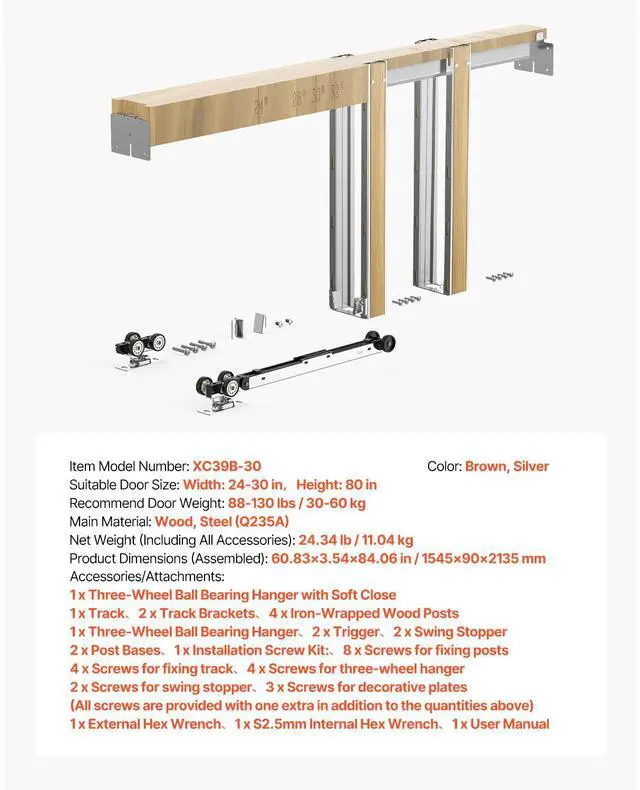 Net Weight (Including All Accessories): 24.34 lb / 11.04 kg,Recommend Door Weight: 88-130 lbs / 30-60 kg,Suitable Door Width: 24-30 in / 610-762 mm,Color: Brown, Silver,Item Model Number: XC39B-30,Product Dimensions (Assembled): 60.83 x 3.54 x 84.06 in / 1545 x 90 x 2135 mm,Main Material: Wood, Steel (Q235A),Suitable Door Height: 80 in / 2032 mm