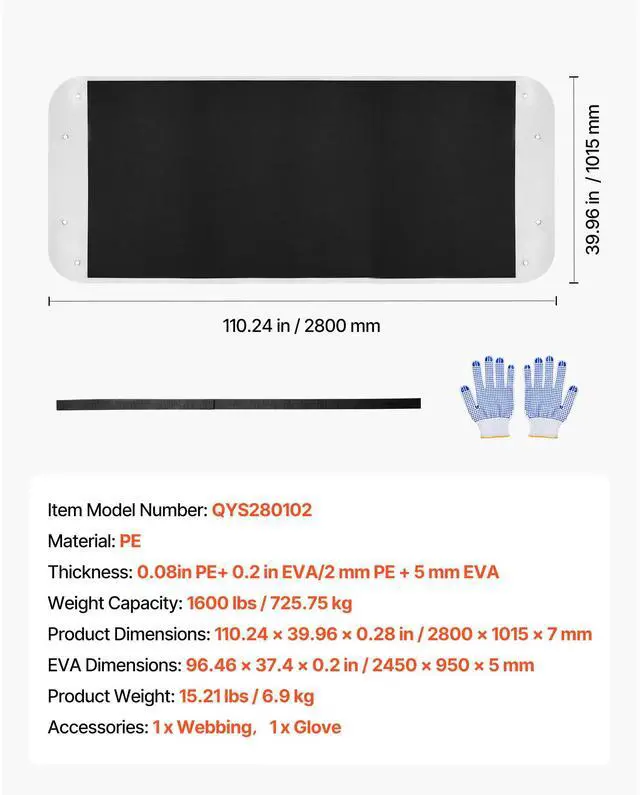 Thickness: 0.08 inch PE0.2 inch/2 mm EVA PE + 5 mm EVA,Weight Capacity: 1600 lbs/725.75 kg,Item Model Number: QYS280102,Product Weight: 15.21 lbs/6.9 kg,Material: PE,Product Dimensions: 110.24×39.96×0.28 inch/2800×1015×7mm,EVA Dimensions: 96.46×37.4×0.2 inch/2450×950×5mm