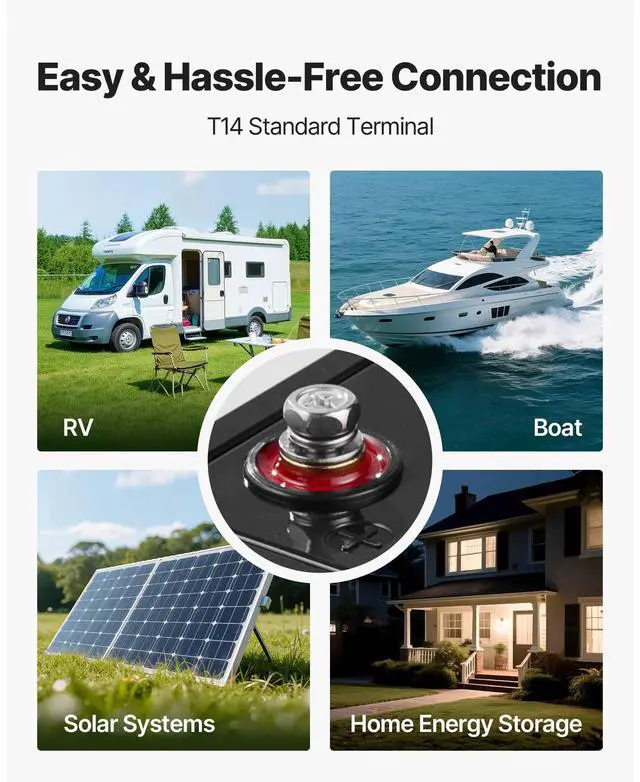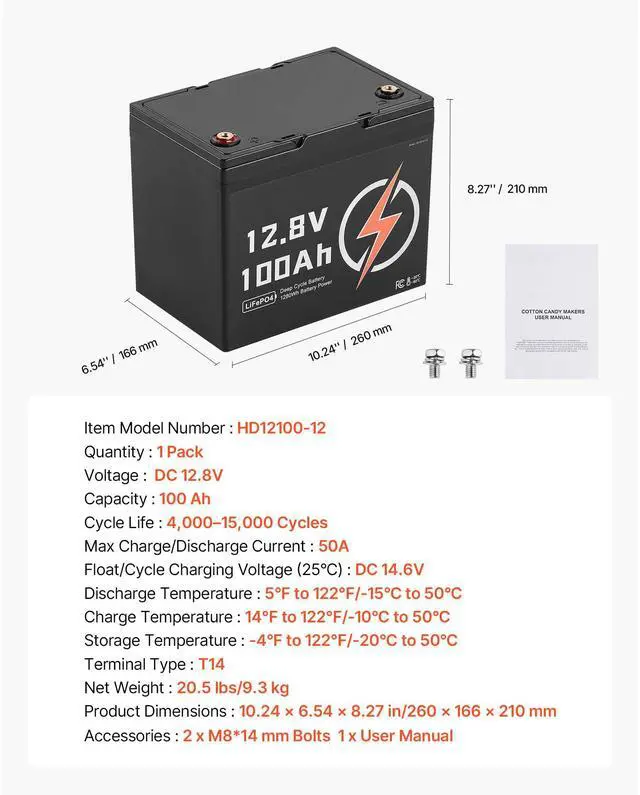 Cycle Life: 4,00015,000 Cycles,Capacity: 100 Ah,Voltage: DC 12.8V,Item Model Number: HD12100-12,Terminal Type: T14,Quantity: 1 Pack,Max Charge/Discharge Current: 50A,Charge Temperature: 14°F to 122°F/-10 to 50,Discharge Temperature: 5°F to 122°F/-15 to 50,Float/Cycle Charging Voltage (25): DC 14.6V,Storage Temperature: -4°F to 122°F/-20 to 50