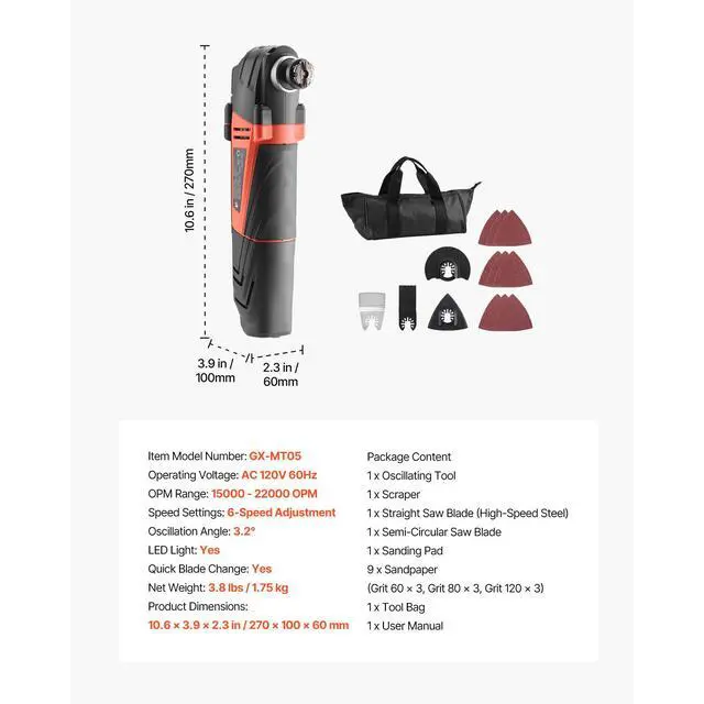 OPM Range: 15000 - 22000 OPM,Oscillation Angle: 3.2°,LED Light: Yes,Quick Blade Change: Yes,Operating Voltage: AC 120V 60Hz,Item Model Number: GX-MT05,Speed Settings: 6-Speed Adjustment,Product Dimensions: 10.6 x 3.9 x 2.3 in / 270 x 100 x 60 mm,Net Weight: 3.8 lbs / 1.75 kg