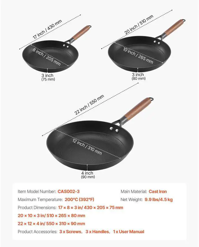 Medium Pan Size: 20 x 10 x 3 in/ 510 x 265 x 80 mm,Large Pan Size: 22 x 12 x 4 in/ 550 x 310 x 90 mm,Item Model Numer: CAS002-3,Maximum Temperature: 392°F / 200°C,Net Weight: 9.9 lbs/4.5 kg,Small Pan Size: 17 x 8 x 3 in/ 430 x 205 x 75 mm,Main Material: Cast Iron