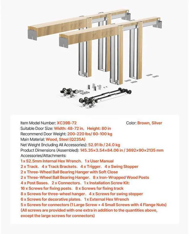 Net Weight (Including All Accessories): 52.91 lb / 24.0 kg,Recommend Door Weight: 200-220 lbs / 60-100 kg,Suitable Door Width: 48-72 in / 1219-1829 mm,Color: Brown, Silver,Item Model Number: XC39B-72,Product Dimensions (Assembled): 145.35 x 3.54 x 84.06 in / 3692 x 90 x 2135 mm,Main Material: Wood, Steel (Q235A),Suitable Door Height: 80 in / 2032 mm