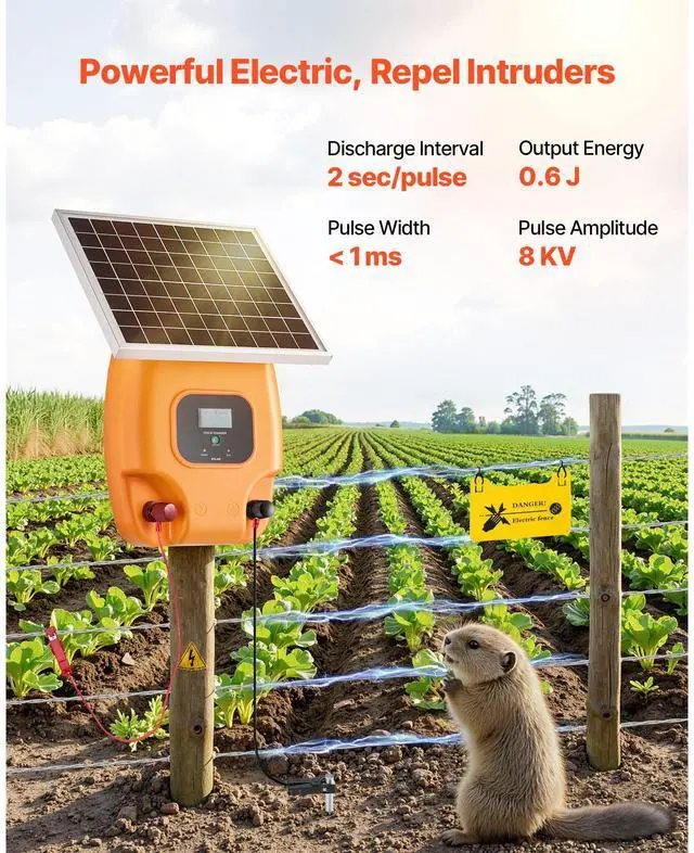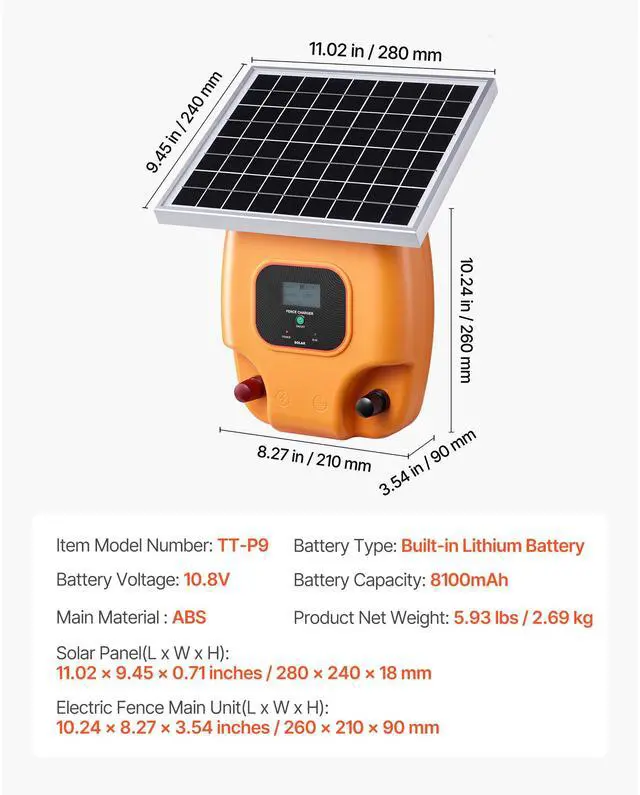 Waterproof Rating: IP65 (Outdoor Waterproof),Battery Voltage: 10.8V,Pulse Width: <1ms,Recommended Effective Range: 1-3 kilometers,Solar Panel(L x W x H): 11.02 × 9.45 × 0.71 inches / 280 × 240 × 18 mm,Electric Fence Main Unit(L x W x H): 10.24 × 8.27 × 3.54 inches / 260 × 210 × 90 mm,Battery Type: Built-in Lithium Battery,Discharge Interval: 2 seconds per pulse,Battery Capacity: 8100mAh,Battery Life: 4-5 days,Output Energy: 0.60 J,Voltage Output: 8 kV,Item Model Number: TT-P9,Product Net Weight: 5.93 lbs / 2.69 kg,Temperature Range: -4 to 122 / -20 to 50,Main Material: ABS