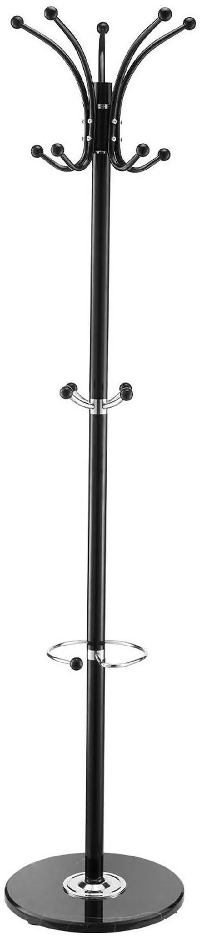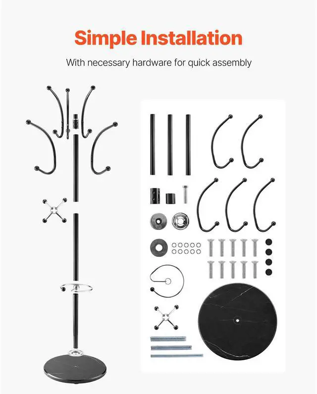 Tube Wall Thickness: 0.024 in / 0.6 mm,Base Thickness: 0.6-0.8 in / 15-20 mm,Total Load Capacity: 33 lbs / 15 kg,Product Dimensions: 14.57 x 14.57 x 69.29 inch / 370 x 370 x 1760 mm,Single Hook Weight Capacity: 6.6 lbs / 3 kg,Type: Freestanding Coat Rack with Umbrella Holder,Base Diameter: 14.6 in / 370 mm ,Item Model Number:GH-8617,Circular Tube Diameter: 1.5 in / 38 mm,Number of Hooks: 14,Net Weight: 18.07 lbs / 8.2 kg,Main Material: Carbon Steel,Base Material: Black Marble