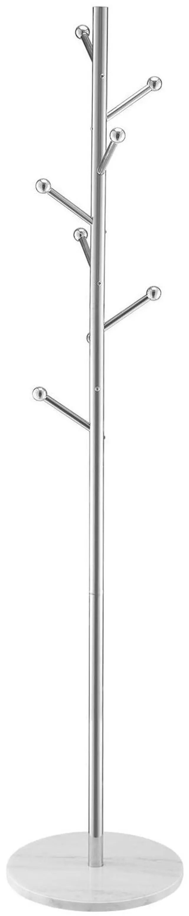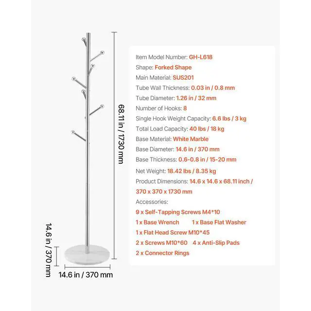 Shape: Forked Shape ,Tube Wall Thickness: 0.03 in / 0.8 mm,Base Thickness: 0.6-0.8 in / 15-20 mm ,Total Load Capacity: 40 lbs / 18 kg,Product Dimensions: 14.57 x 14.57 x 68.11 inch / 370 x 370 x 1730 mm,Single Hook Weight Capacity: 6.6 lbs / 3 kg,Base Diameter: 14.6 in / 370 mm,Item Model Number: GH-L618,Number of Hooks: 8,Net Weight: 18.42 Ibs / 8.35 kg,Main Material: SUS201,Base Material: White Marble ,Tube Diameter: 1.26 in / 32 mm