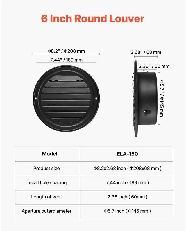Product Dimensions (with rubber seal): 8.2 x 2.68 inch / 208 x 68 mm,Protection Screen: Yes, Non-removable,Shape: Round,Color: Black,Item Model Number: ELA-150,Quantity: 2 pcs,Net Weight: 1.12 lbs / 0.51 kg,Main Material: SUS304 Stainless Steel