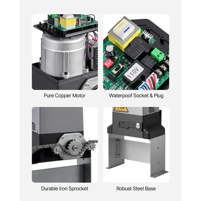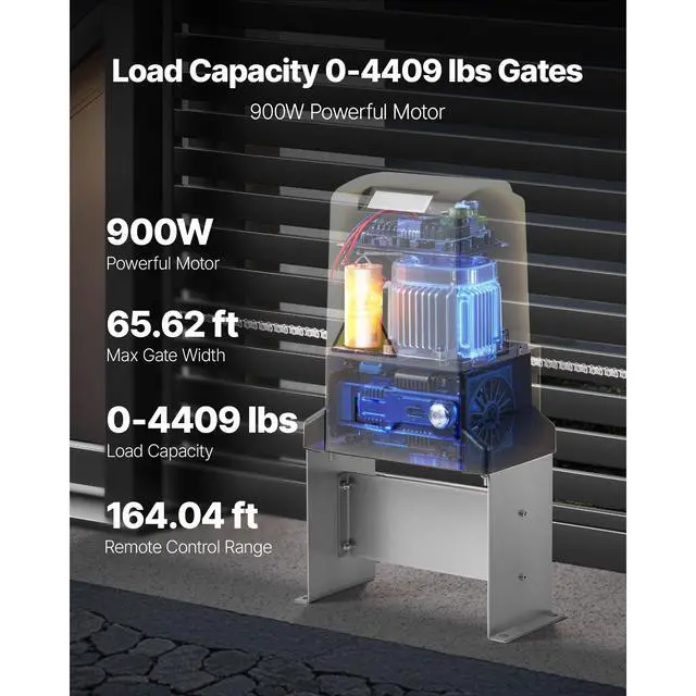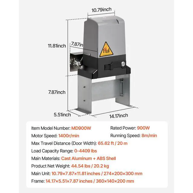 Motor Speed: 1400r/min,Frame: 14.17×5.51×7.87 inches / 360×140×200 mm,Max Travel Distance (Door Width): 65.62 ft / 20 m,Main Materials: Cast Aluminum + ABS Shell,Running Speed: 8m/min,Item Model Number: MD900W,Product Net Weight: 44.54 lbs / 20.2 kg,Rated Power: 900W,Load Capacity Range: 0-4409.24 lbs / 0-2000 kg,Main Unit: 10.79×7.87×11.81 inches / 274×200×300 mm