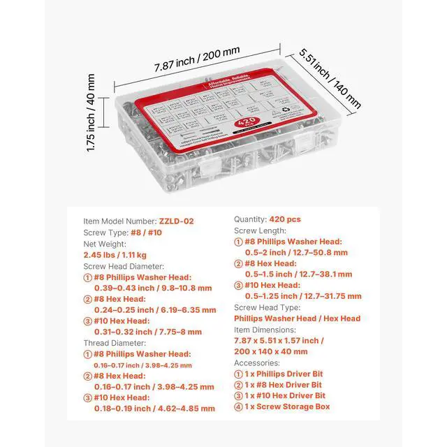 Thread Diameter:,Screw Length:, #8 Phillips Washer Head: 0.52 inch / 12.750.8 mm,Item Model Number: ZZLD-02, #10 Hex Head: 0.51.25 inch / 12.731.75 mm,Screw Head Type: Phillips Washer Head / Hex Head,Quantity: 420 pcs,Item Dimensions: 7.87 x 5.51 x 1.57 inch / 200 x 140 x 40 mm,Screw Type: #8 / #10,Screw Head Diameter:, #8 Hex Head: 0.51.5 inch / 12.738.1 mm,Net Weight: 2.45 lbs / 1.11 kg