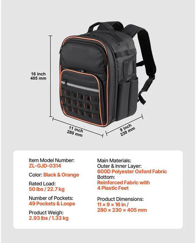 Main Materials:,Outer & Inner Layer: 600D Polyester Oxford Fabric,Color: Black & Orange,Item Model Number: ZL-GJD-0314,Product Weight: 2.93 lbs / 1.33 kg,Bottom: Reinforced Fabric with 4 Plastic Feet,Product Dimensions: 11 x 9 x 16 in / 280 x 230 x 405 mm,Number of Pockets: 49 Pockets & Loops,Rated Load: 50 lbs / 22.7 kg