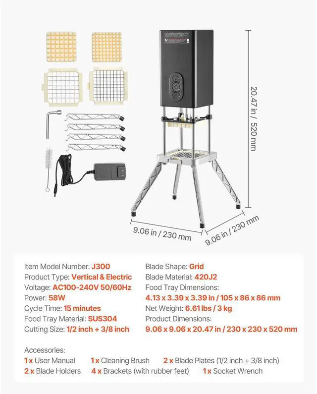 Blade Material: 420J2,Blade Shape: Grid,Cutting Size: 1/2 inch + 3/8 inch,Food Tray Material: SUS304,Product Type: Vertical & Electric,Voltage: AC100-240V 50/60Hz,Food Tray Dimensions: 4.13 x 3.39 x 3.39 inch / 105 x 86 x 86 mm,Item Model Number: J300,Product Dimensions: 9.06 x 9.06 x 20.47 inch / 230 x 230 x 520 mm,Cycle Time: 15 minutes,Net Weight: 6.61 lbs / 3 kg,Power: 58W