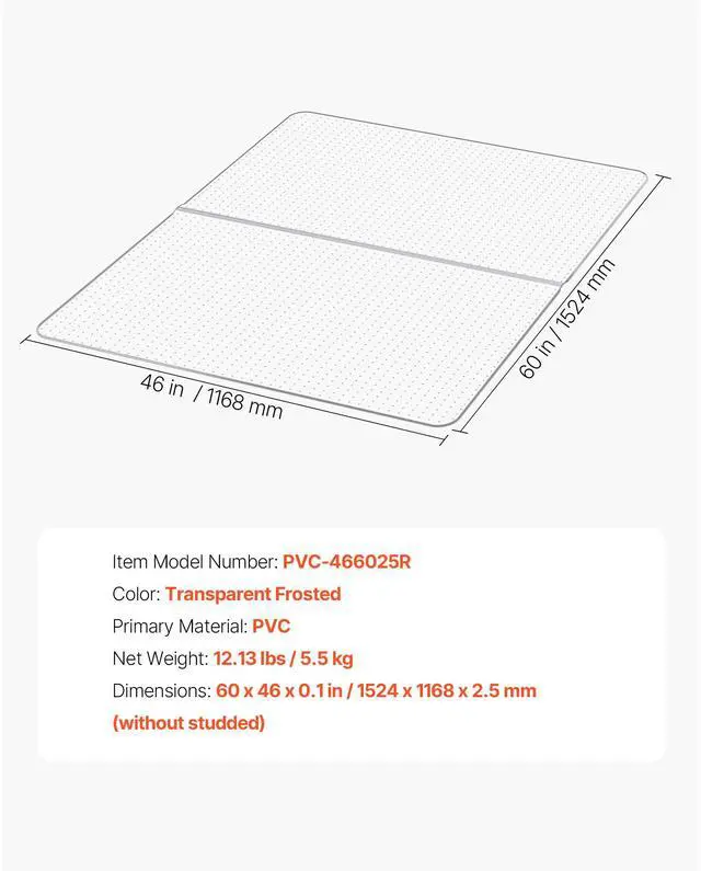 Primary Material: PVC,Color: Transparent Frosted,Item Model Number: PVC-466025R,Dimensions: 60.24 x 46.46 x 0.1 in / 1530 x 1180 x 2.5 mm (without studded),Net Weight: 13.23 lbs / 6 kg