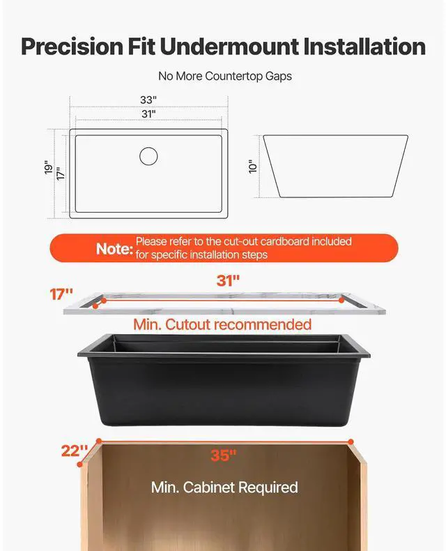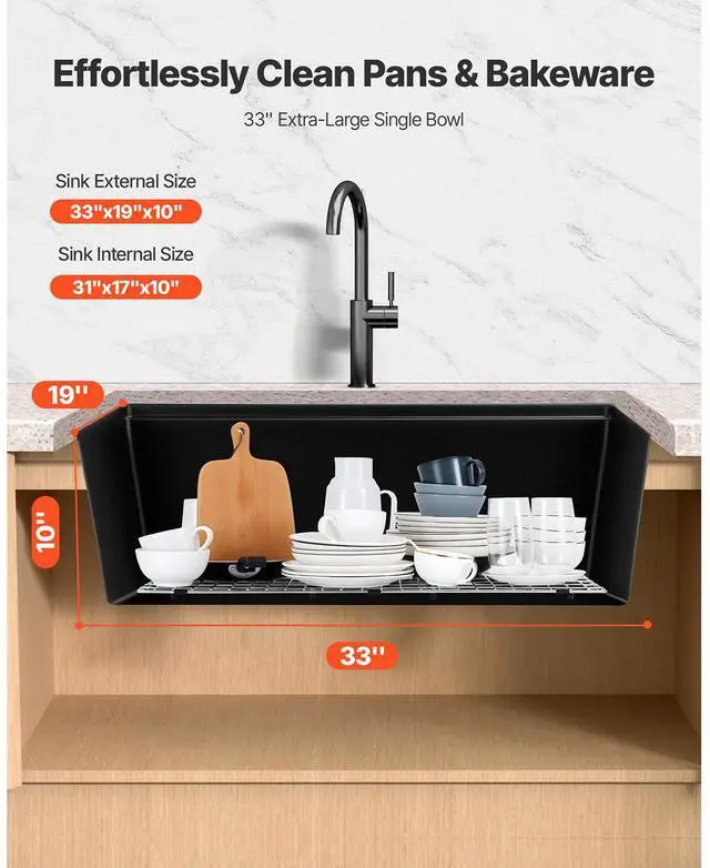 Type: Undermount,Roll-Up Rack Size: 17x12 inch / 42x29.5 cm,Bamboo Board Size: 17x10 inch / 42x26 cm,Grid Size: 28x13 inch / 71.5x34 cm xR15,Color: Black ,Item Model Number: 838482-SS ,Product Net Weight: 41.22 lb / 18.7 kg (including all accessories),Sink Internal Size: 31x17x10 inch / 782x432x254mm,Sink External Size: 33x19x10 inch / 838x482x254 mm,Min. Cabinet Size: 35x22 inch / 900x550 mm,Main Material: Quartz sand & Resin,Min. Recommended Cutout Size: 31x17 inch / 782x432 mm