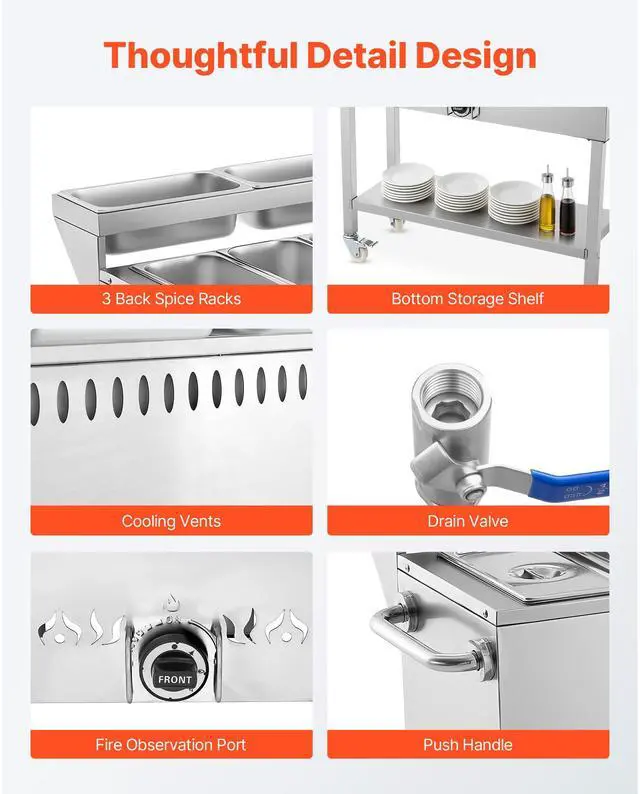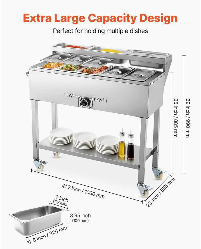 Compatible Gas Type: Propane,Water Required: Yes,Housing Material: Stainless steel,Item Model Number: RTC-8,With Wheels: 4 x 3-inch Wheels with Self-locking Mechanism,Product Dimensions (L x W x H): 41.7 x 23 x 39 inch / 1060 x 585 x 990 mm,Net Weight: 56 lbs / 25.4 kg,Pan Configuration: 5 x 1/3-Size Food Pans,Total Power Output: 11,600 BTU