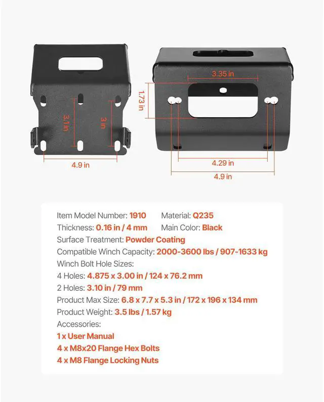 Thickness: 0.16 in / 4 mm,Main Color: Black,Winch Bolt Hole Sizes:,Item Model Number: 1910,Surface Treatment: Powder Coating,2 Holes: 3.10 in / 79 mm,Product Weight: 3.37 lbs / 1.53 kg,Material: Q235,Compatible Winch Capacity: 2000-3600 lbs / 907-1633 kg,4 Holes: 4.875 x 3.00 in / 124 x 76.2 mm,Product Max Size: 6.5 x 7.28 x 5 in / 165 x 185 x 127 mm
