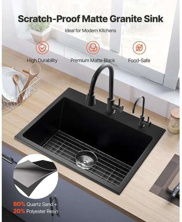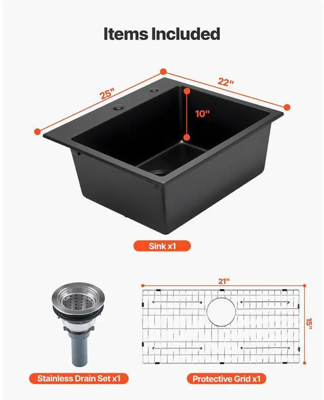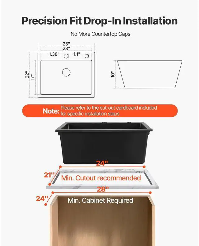 Type: Top mount,Grid Size: 21x15 inch /52.5x37.5 cm xR15,Color: Black ,Item Model Number: CS6356 ,Product Net Weight: 33.95 lb / 15.4 kg,Sink Internal Size: 23x17x10 inch / 575x424x254 mm,Sink External Size: 25x22x10 inch /635x559x254 mm ,Min. Cabinet Size: 28x24 inch / 700x600 mm,Main Material: Quartz sand & Resin,Min. Recommended Cutout Size: 24x21 inch / 610x530 mm