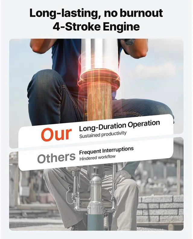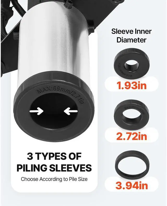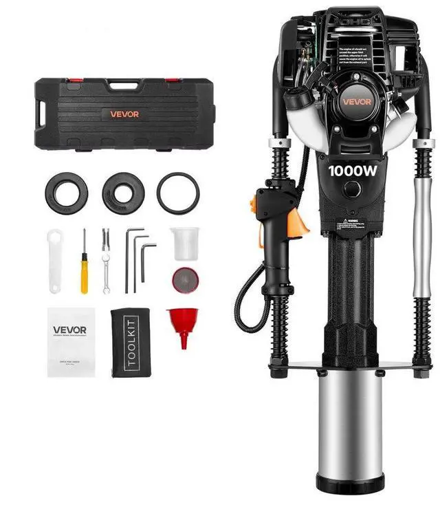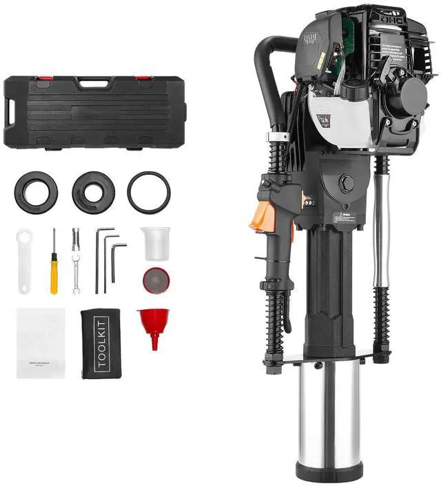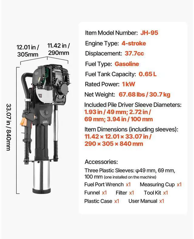 Max Torque: 1.4 N·m,Impact Energy: 55 J,Included Pile Driver Sleeve Diameters: 1.93 in / 49 mm; 2.72 in / 69 mm; 3.94 in / 100 mm,Displacement: 37.7cc,Fuel Type: Gasoline,Engine Type: 4-stroke,Main Materials: Die-cast Aluminum (ADC12) + Steel (40Cr) + Plastic (PA6),Item Dimensions (including sleeves): 11.42 x 12.01 x 33.07 in / 290 x 305 x 840 mm,Rated Speed: 6500 r/min,Speed at Max Torque: 5500 r/min,Item Model Number: JH-95,Fuel Tank Capacity: 0.65 L,Rated Power: 1 kW,Impact Frequency: 15002000 BPM,Net Weight: 67.68 lbs / 30.7 kg