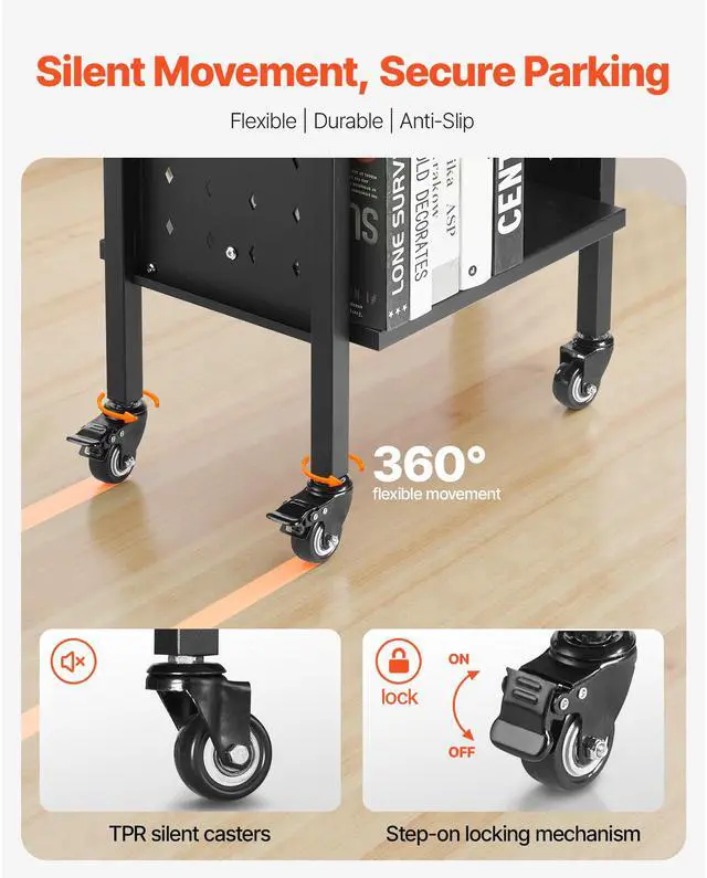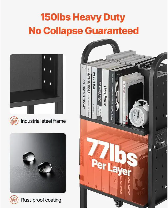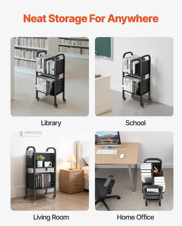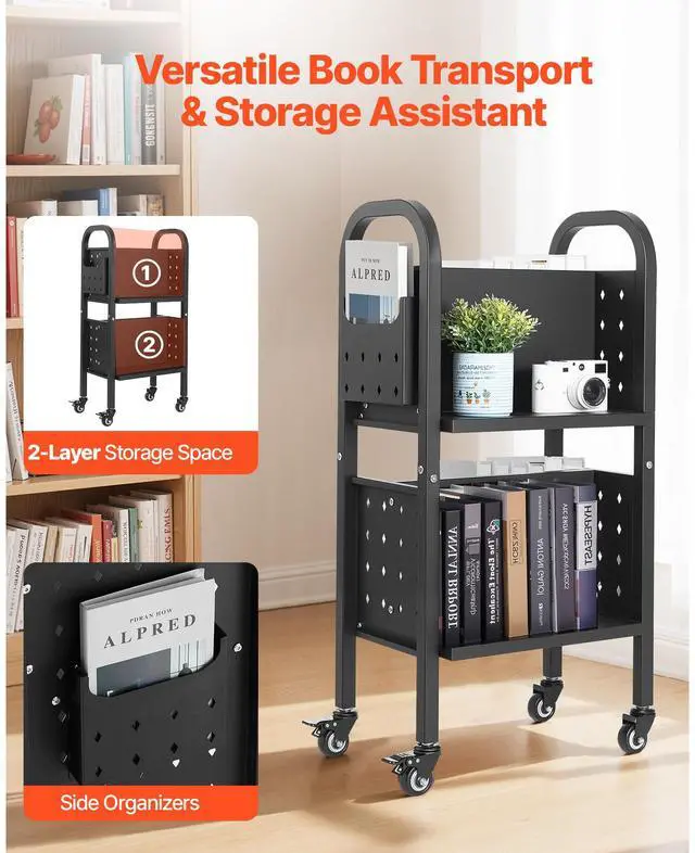 VEVOR 2-Tier Rolling Book Cart Double Sided L-Shaped Shelves Book Truck in Black
