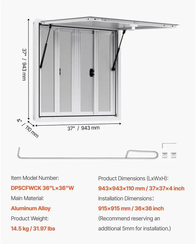 Product Dimension: 943x943x110 mm / 37x37x4 inch,Installation Dimension: 915x915 mm / 36x36 inch,Item Model Number: DPSCFWCK 36"L×36"W,Product Weight: 14.5 kg / 31.97 lbs,Main Material: Aluminum Alloy