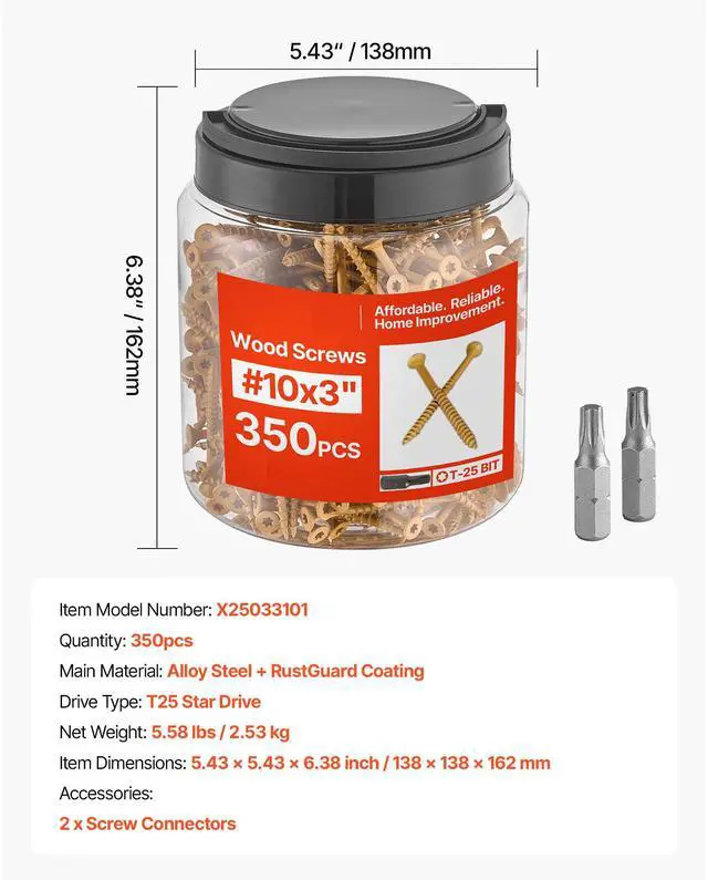 Item Model Number: X25033101,Quantity: 350pcs,Drive Type: T25 Star Drive,Item Dimensions: 5.43 x 5.43 x 6.38 inch / 138 x 138 x 162 mm,Net Weight: 5.82 lbs / 2.64 kg,Main Material: Alloy Steel + RustGuard Coating