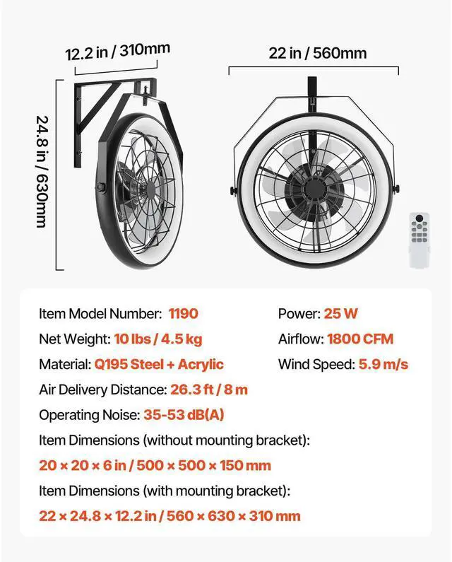 Airflow: 1800 CFM,Air Delivery Distance: 26.3 ft / 8 m,Item Dimensions (without mounting bracket): 20 x 20 x 6 in / 500 x 500 x 150 mm,Item Dimensions (with mounting bracket): 22 x 24.8 x 12.2 in / 560 x 630 x 310 mm,Operating Noise: 53 dB(A),Wind Speed: 5.9 m/s,Item Model Number: 1190-110,Material: Q195 Steel + Acrylic,Net Weight: 10 lbs / 4.5 kg,Power: 25 W