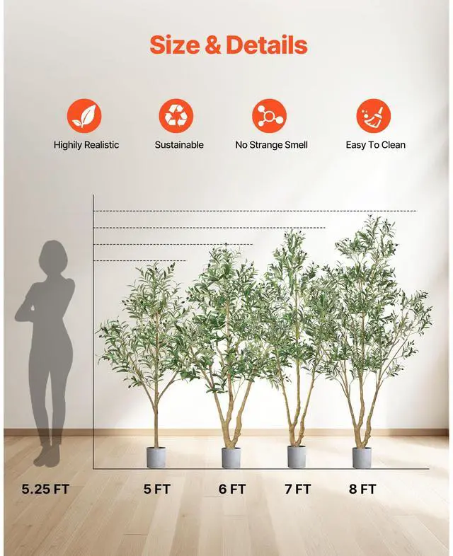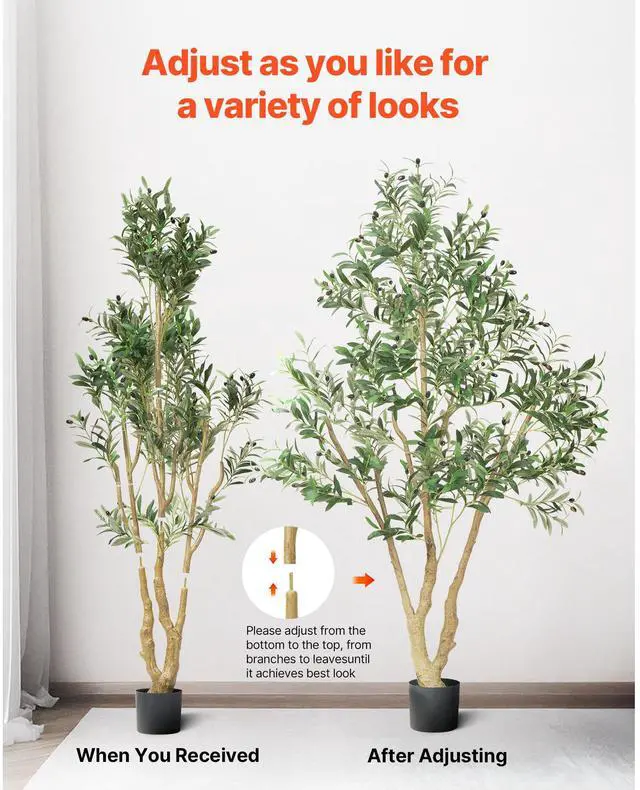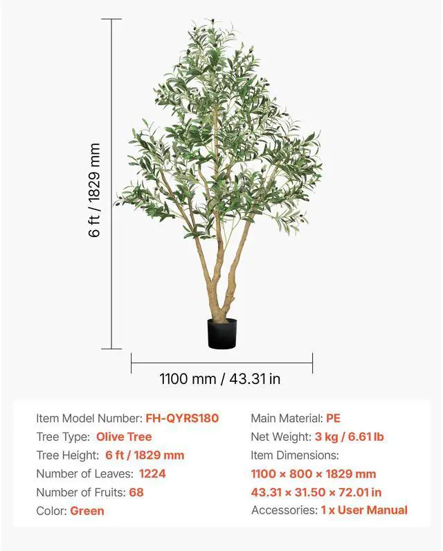 Tree Height: 6 ft / 1829 mm,Item Dimensions (L x W x H): 1100 x 800 x 1830 mm / 43.31 x 31.50 x 72.05 in,Color: Green,Item Model Number: FH-QYRS180,Tree Type: Olive Tree,Number of Fruits: 68,Number of Leaves: 1224,Net Weight: 6.48 kg / 14.29 lb,Main Material: PE (Polyethylene)