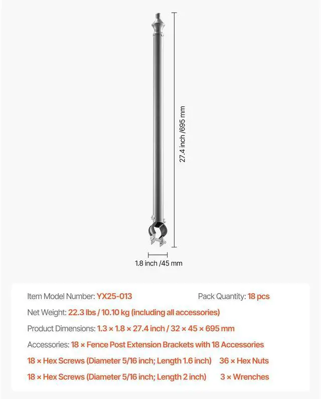 Pack Quantity: 18 pcs,Item Model Number: YX25-013,Product Dimensions: 1.3 × 1.8 × 27.4 inch / 32 × 45 × 695 mm,Net Weight: 22.3 lbs / 10.10 kg (including all accessories)