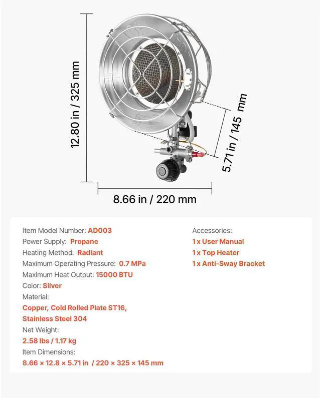 Maximum Heat Output: 15000 BTU,Color: Silver,Item Model Number: AD003,Heating Method: Radiant,Material: Copper, Cold Rolled Plate ST16, Stainless Steel 304,Item Dimensions: 8.66 x 12.80 x 5.71 inches / 220 x 325 x 145 mm,Maximum Operating Pressure: 0.7 MPa,Net Weight: 2.58 lbs / 1.17 kg,Power Supply: Air Power
