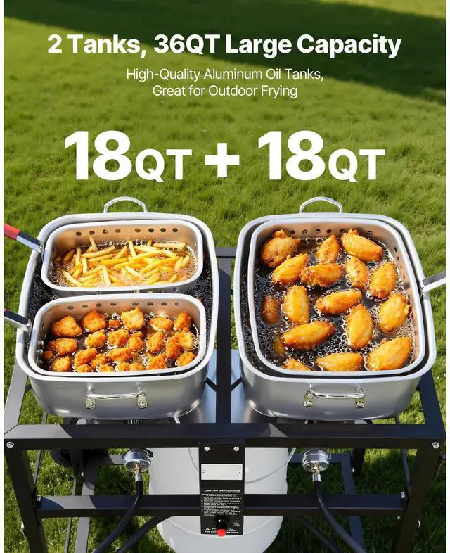 Fryer Size: 36.61x22.44x29.53 in / 930x570x750 mm,Tank Size: 15.83x12.68x5.31 in / 402x322x135 mm,Number of Burners: 2,Burner Heat Output: 40,000 BTU/HOUR (each),Fuel Type: Propane,Tank Capacity: 36QT / 34L (total),Main Materials: Stainless Steel ,Small Basket Size: 11.42x7.68x4.13 in / 290x195x105 mm,Big Basket Size: 15.67x12x4.13 in / 398x304x105 mm,Item Model Number: DBF18QT,Product Weight: 38.58 lb / 17.5 kg,Number of Fry Baskets: 3,Tube Length: 24 in / 610 mm