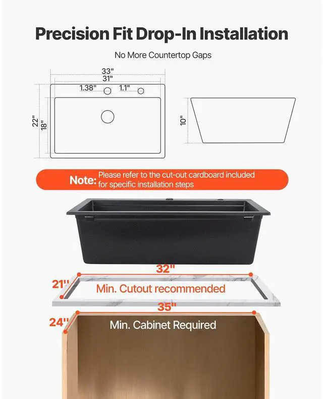 Type: Top mount,Roll-Up Rack Size: 17x12 inch /42x29.5 cm,Bamboo Board Size: 16x10 inch /40.3x26 cm,Grid Size: 27x13 inch /69.5x33 cm xR15,Color: Black ,Item Model Number: 8456-ST ,Product Net Weight: 50 lb / 22.5 kg (including all accessories),Sink Internal Size: 30x17x10 inch / 760x430x250 mm,Sink External Size: 33x22x10 inch / 840x560x250 mm,Min. Cabinet Size: 35x24 inch / 900x600 mm,Main Material: Quartz sand & Resin,Min. Recommended Cutout Size: 32x21 inch/ 815x535 mm