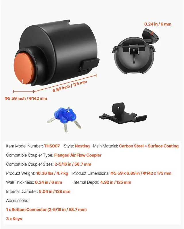 Compatible Coupler Type: Flanged Air Flow Coupler,Item Model Number: THS007,Product Weight: 10.36 lbs / 4.7 kg,Style: Nesting,Wall Thickness: 0.24 in / 6 mm,Product Dimensions: 5.59 x 6.89 in / 142 x 175 mm,Internal Depth: 4.92 in / 125 mm,Internal Diameter: 5.04 in / 128 mm,Main Material: Carbon Steel + Surface Coating,Compatible Coupler Size: 2-5/16 in / 58.6 mm