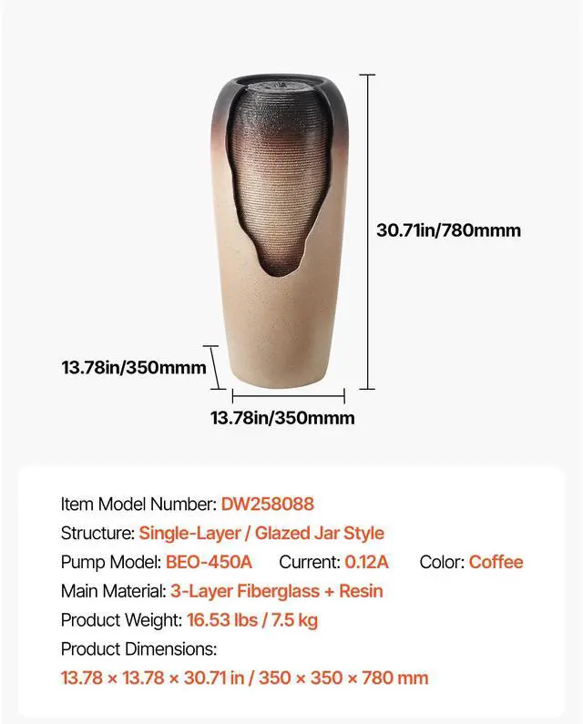Pump Model: BEO-450A,Color: Coffee,Item Model Number: DW258088,Product Weight: 16.53 lbs / 7.5 kg,Structure: Single-Layer / Glazed Jar Style,Product Dimensions: 13.78 x 13.78 x 30.71 in / 350 x 350 x 780 mm,Current: 0.12A,Main Material: 3-Layer Fiberglass + Resin