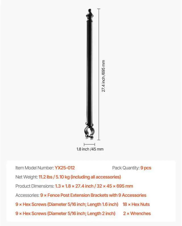 Pack Quantity: 9 pcs,Item Model Number: YX25-012,Product Dimensions: 1.3 × 1.8 × 27.4 inch / 32 × 45 × 695 mm,Net Weight: 11.2 lbs / 5.10 kg (including all accessories)