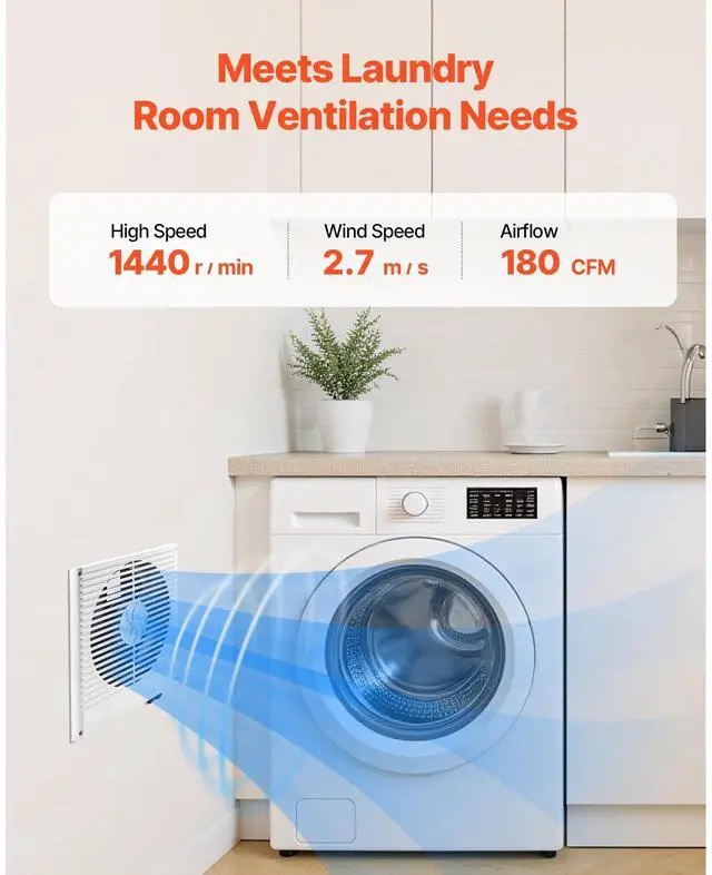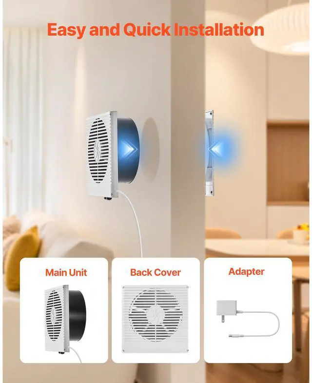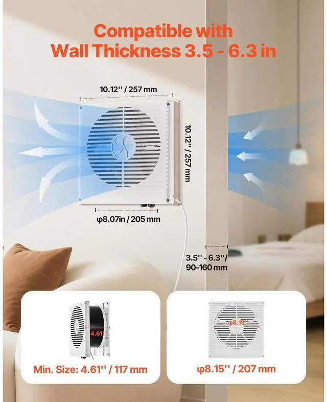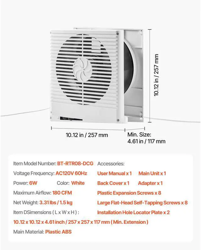 Airflow Direction Adjustment: Bi-directional Adjustable, Button Control,Maximum Airflow (CFM): 180 CFM,Item Dimensions (L x W x H): 10.12 x 10.12 x 4.61 inch / 257 x 257 x 117 mm (Min. Extension),Color: White,Noise (dB): 46dB (Measured at 1 Meter),Speed (r/min): 1440 r/min,Fan Diameter: 7.48 inch / 190 mm,Temperature Control: None,Voltage Frequency: AC120V 60Hz,Item Model Number: BT-RTR08-DCG,Wall Thickness Compatibility: 3.5-6.3 Inch / 90-160 mm,Net Weight: 3.31 lbs / 1.5 kg,Power: 6W,Main Material: Plastic ABS