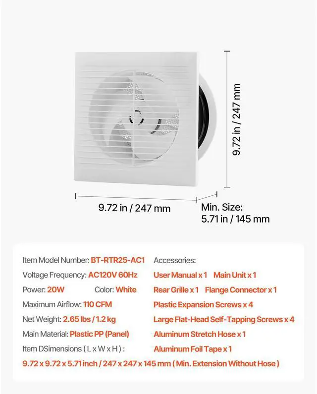 Speed (r/min): 1486 r/min,Fan Diameter: 6.3 inch / 160 mm,Maximum Airflow (CFM): 110 CFM,Voltage Frequency: AC120V 60Hz,Color: White,Item Model Number: BT-RTR25-AC1,Noise (dB): 46dB (Measured at 1 Meter),Net Weight: 2.65 lbs / 1.2 kg,Power: 20W,Main Material: Plastic PP (Panel),Item Dimensions (L x W x H Without Hose): 9.72 x 9.72 x 5.71 in / 247 x 247 x 145 mm (Min. Extension)