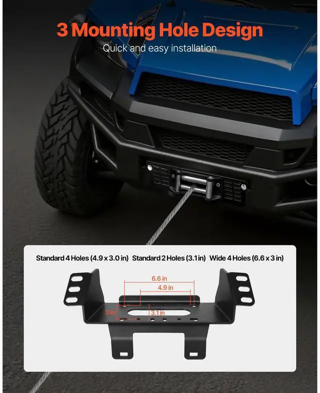 Thickness: 1/5 inch (5 mm),Main Color: Black,Winch Bolt Hole Sizes:,Item Model Number: 1908,Surface Treatment: Powder Coating,2 Holes: 3.10 in / 79 mm,Product Weight: 8.29 lbs / 3.76 kg,Material: Q235,Compatible Winch Capacity: 2000-3600 lbs / 907-1633 kg,4 Holes: 4.875 x 3.00 in / 124 x 76.2 mm,Product Max Size: 16.65 x 5.59 x 7.76 in / 423 x 142 x 197 mm