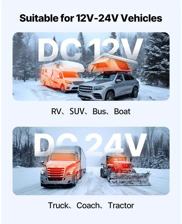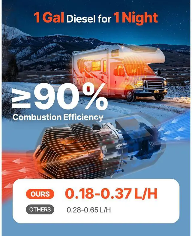Fuel Consumption: 0.18-0.37 L/h,Fuel Efficiency: 90%,Operating Noise: 75dB,Operating Voltage: DC 12-24V,Item Model Number: ZM8001,Applicable Altitude: Below 9843 ft / 3000 m,Adjustable Temperature Range: 46-97 / 8-36 Adjustable,Net Weight: 11.90 lbs / 5.4 kg (including all accessories),Product Size: 14.88 x 5.55 x 7.09 inch / 378 x 141 x 180 mm
